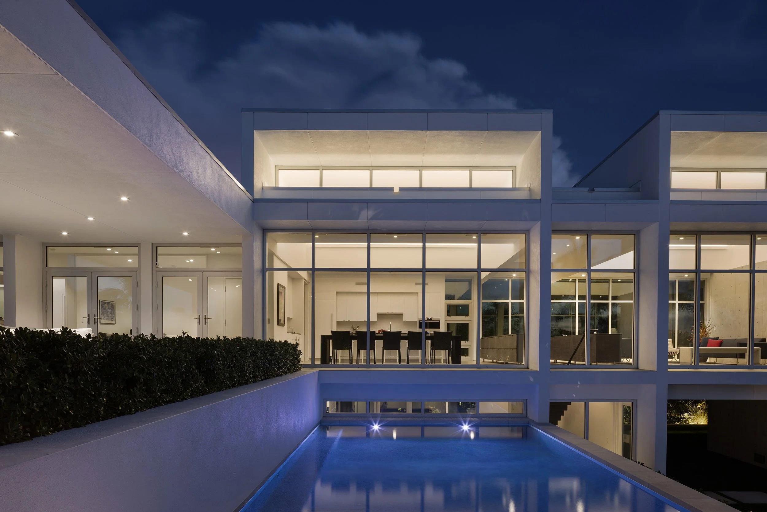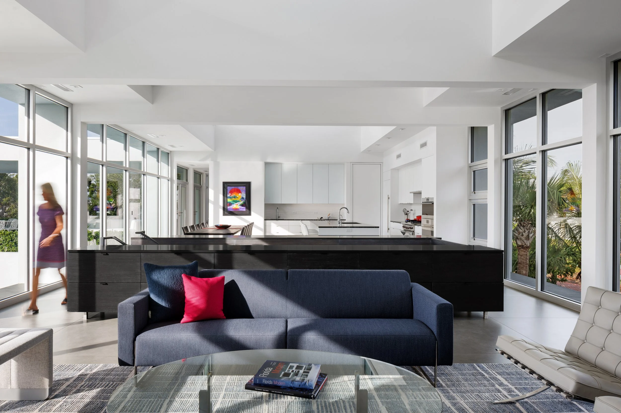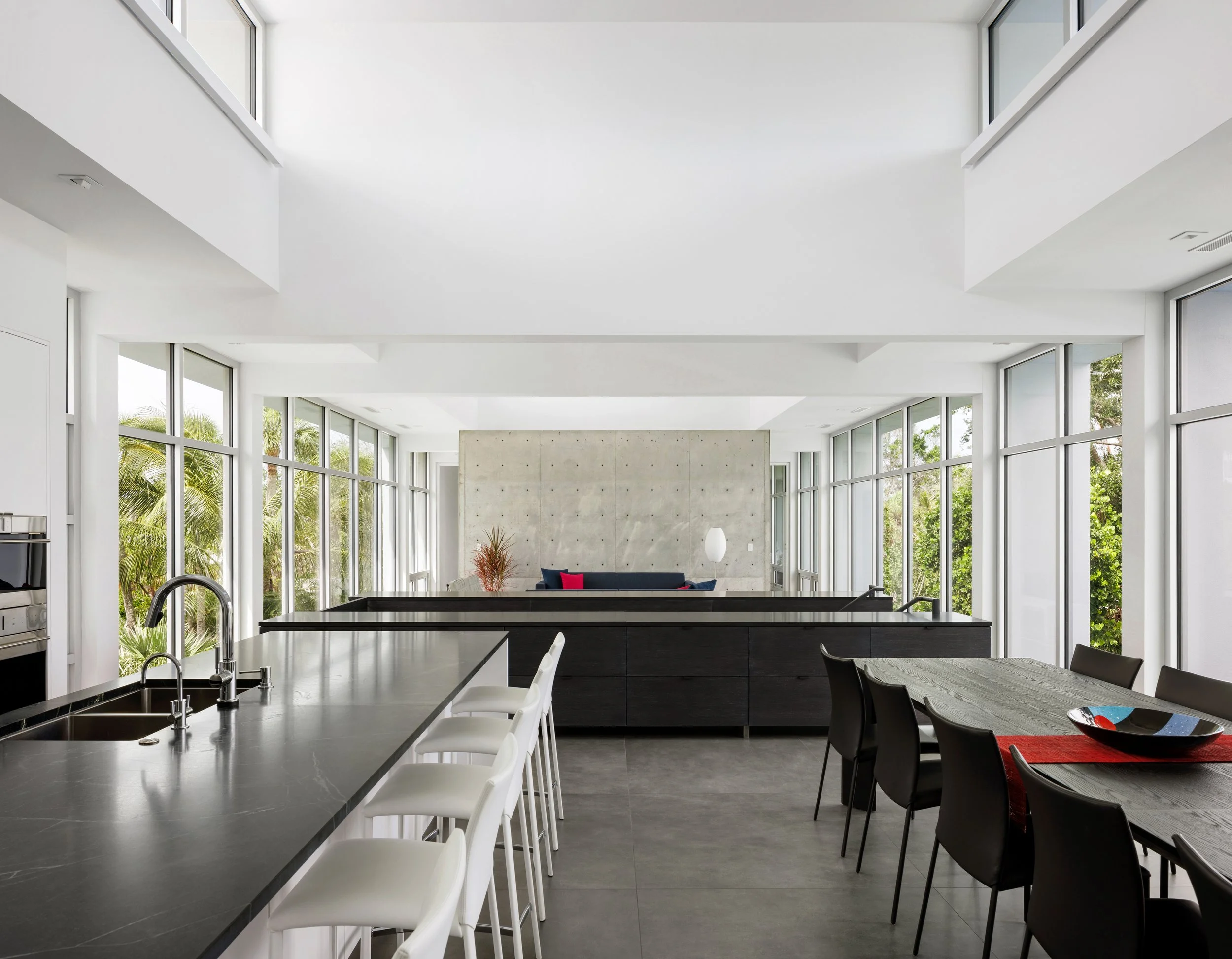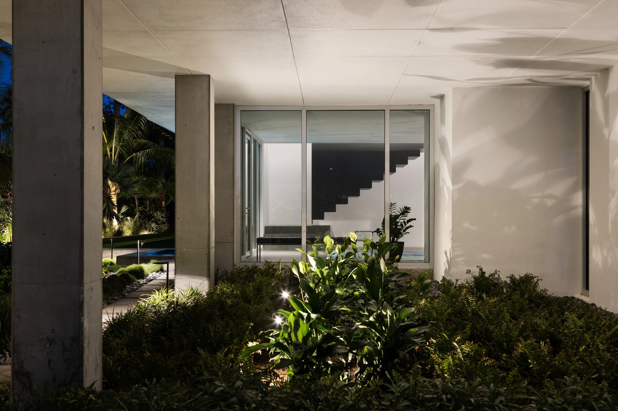 At ground level the landscape design includes a raised lawn area. This terrace surrounded by dense tropical landscape, serves as the open space for large gatherings and provides unobstructed views from the house to the surrounding landscape. The elevated house is transverse to the terraced lawn with the living room looking down into the open space that it provides on both the front and back sides of the house. The house’s elevated vantage point increases views into landscape on adjoining properties and natural areas while providing a more interesting perspective of on-site areas. For outdoor events, the terrace’s extension into the front acts as a forecourt with passage beneath the house as the entry into the open rear yard area where events occur.